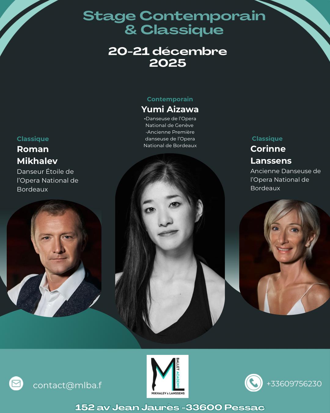 Stage de danse classique et contemporaine à Pessac avec Roman Mikhalev, Corinne Lanssens et Yumi Aizawa. Deux jours de travail technique et artistique pour danseurs de niveaux moyen et avancé.